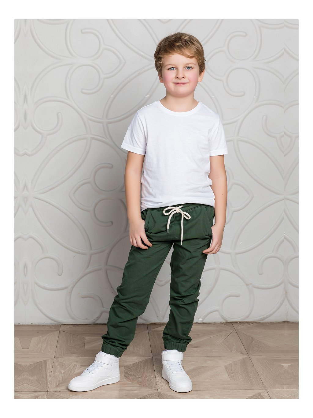 Chlapecké bavlněné plátěné kalhoty s gumou a šňůrkou na stažení, dole do gumy, dvě kapsy