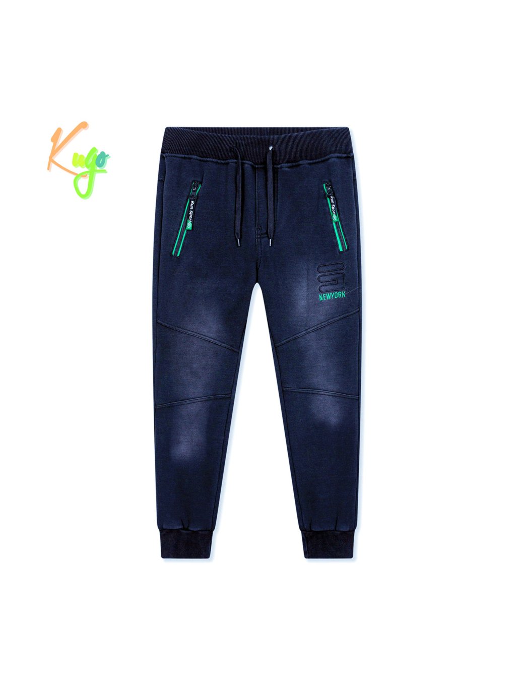 Chlapecké riflové kalhoty / tepláky, zateplené jemným chloupkem, dvě kapsy na zapínání na přední straně, dvě kapsy na zadní straně, ukončení do nápletu, v pase do gumy, šňůrka na stažení.