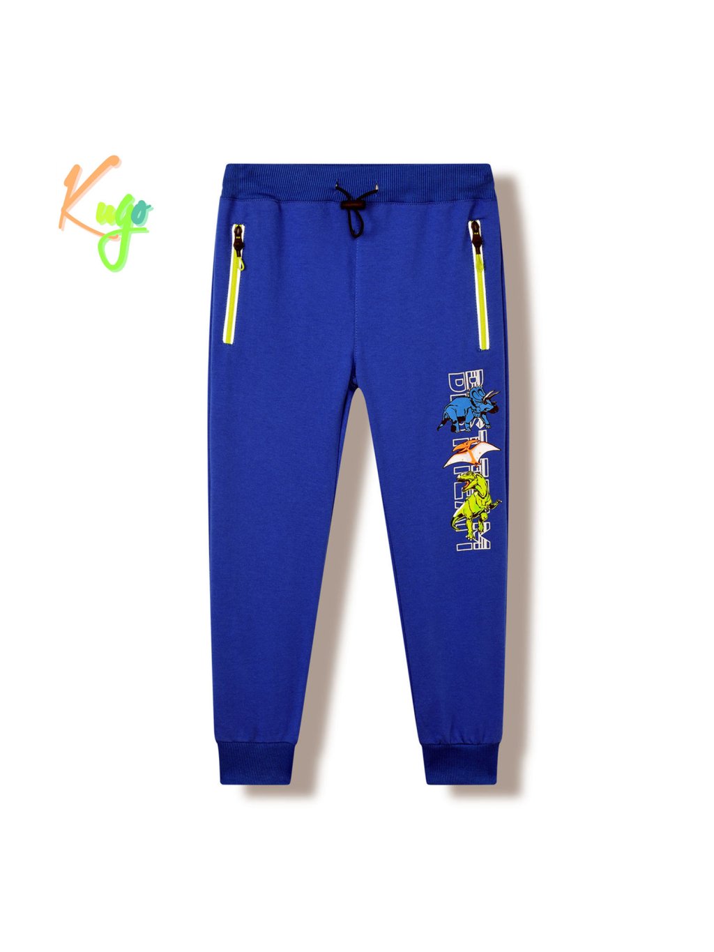 Chlapecké dlouhé bavlněné tepláky s potiskem dinosaurů, dvě kapsy na zapínání, v pase guma a olivka na stažení, dole ukončení do nápletu