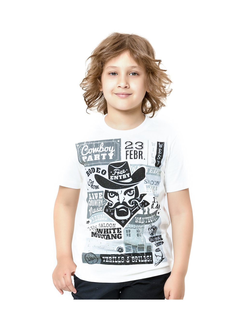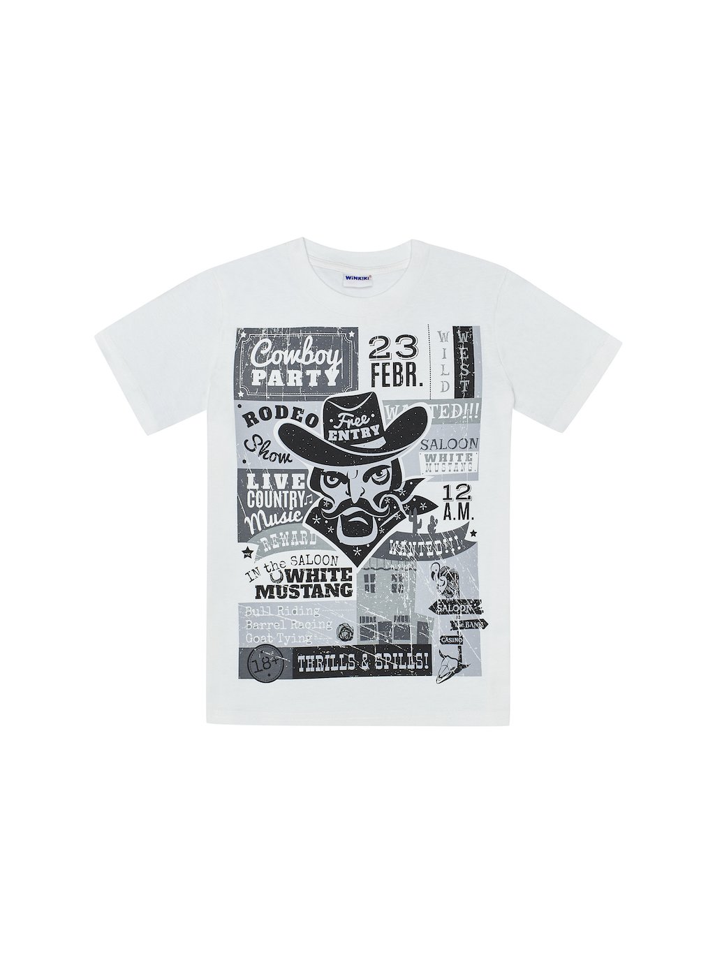 Chlapecké tričko Cowboy Party s krátkým rukávem v bílé barvě. Zajímavý design z kolekce Bandits. Na přední straně je koláž z kovbojských nálepk. Kdo čte nebo se dívá na indiány a kovboje, tak to musí mít. Ideální do školy a na doma.