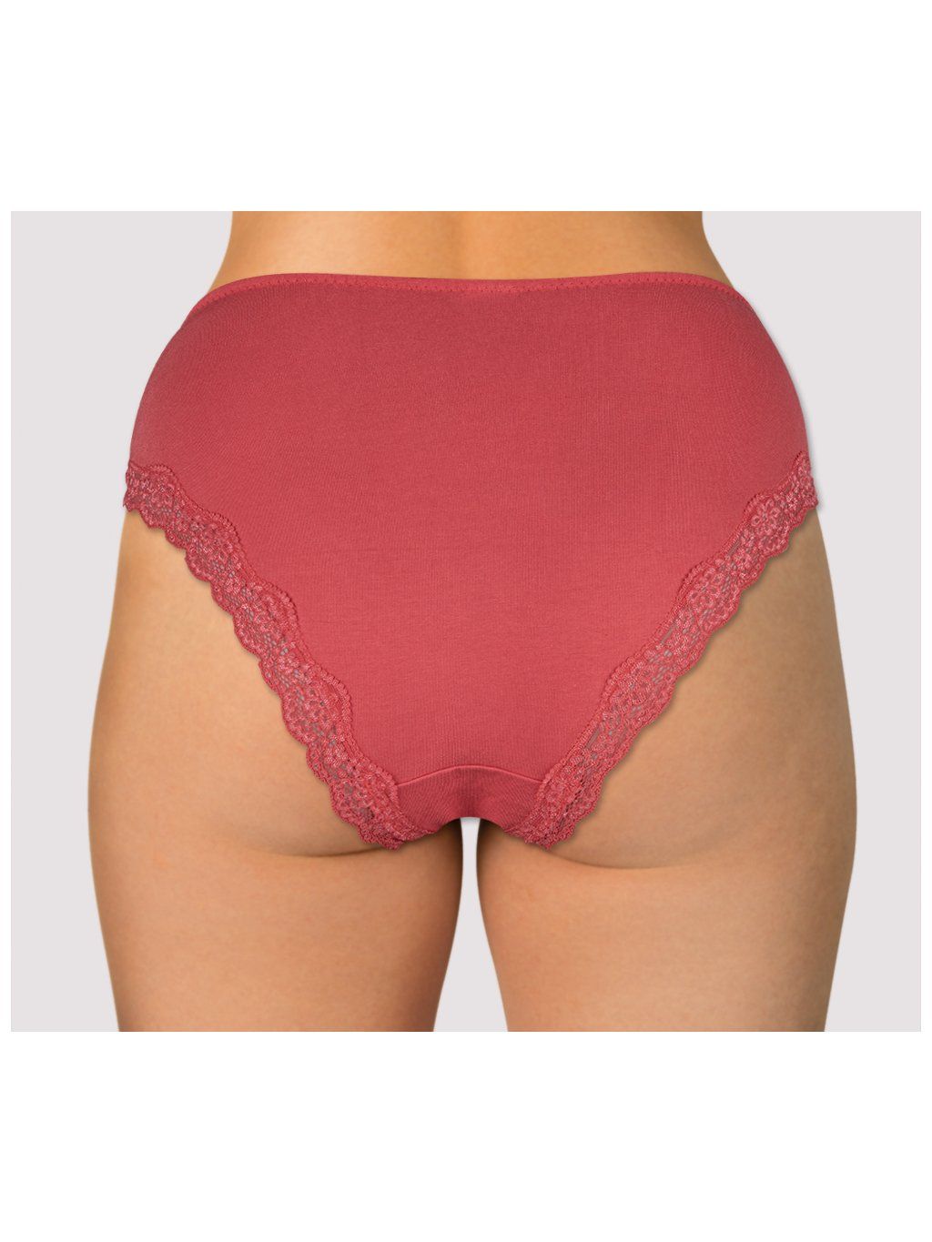 Dámské kalhotky klasického střihu. Kalhotky jsou vyrobeny z velmi kvalitní elastické bavlny s příměsí vlákna Tactel, které dodává materiálu hebkost a lesk. Materiál se skvěle přizpůsobí postavě a drží stálý tvar prádla. Pas je olemovaný elastickou paspulí. Kalhotky jsou kolem nohou lemované elastickou krajkou. Bavlněný klínek.