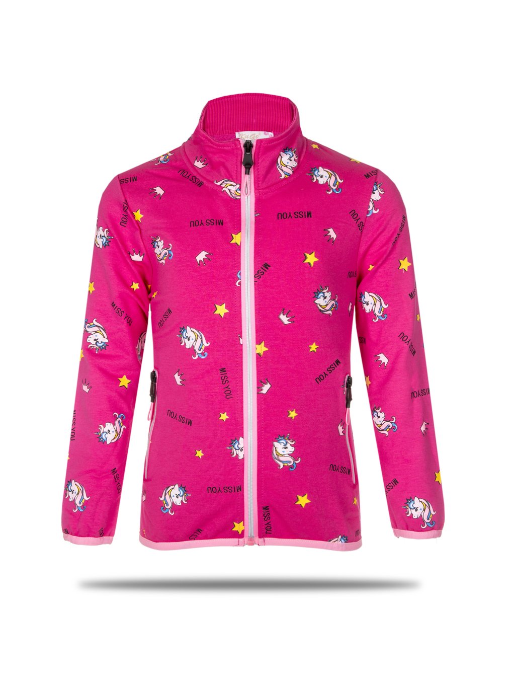 Dívčí slabší mikina ke krku KUGO s potiskem jednorožců, 2 kapsy na zapínaní, lemování kolem zipů a ve spodní části