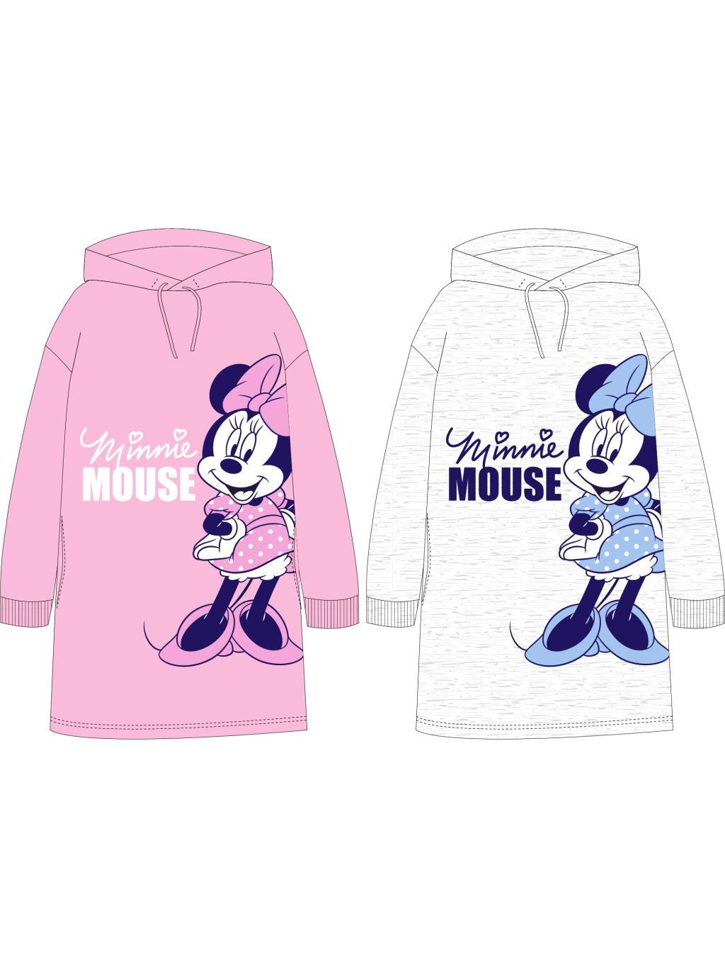 Dívčí prodloužená mikina s kapucí (mikinové šaty) s jemným chloupkem, motiv Minnie Mouse, u krku šňůrka na stažení, dvě postranní kapsy.