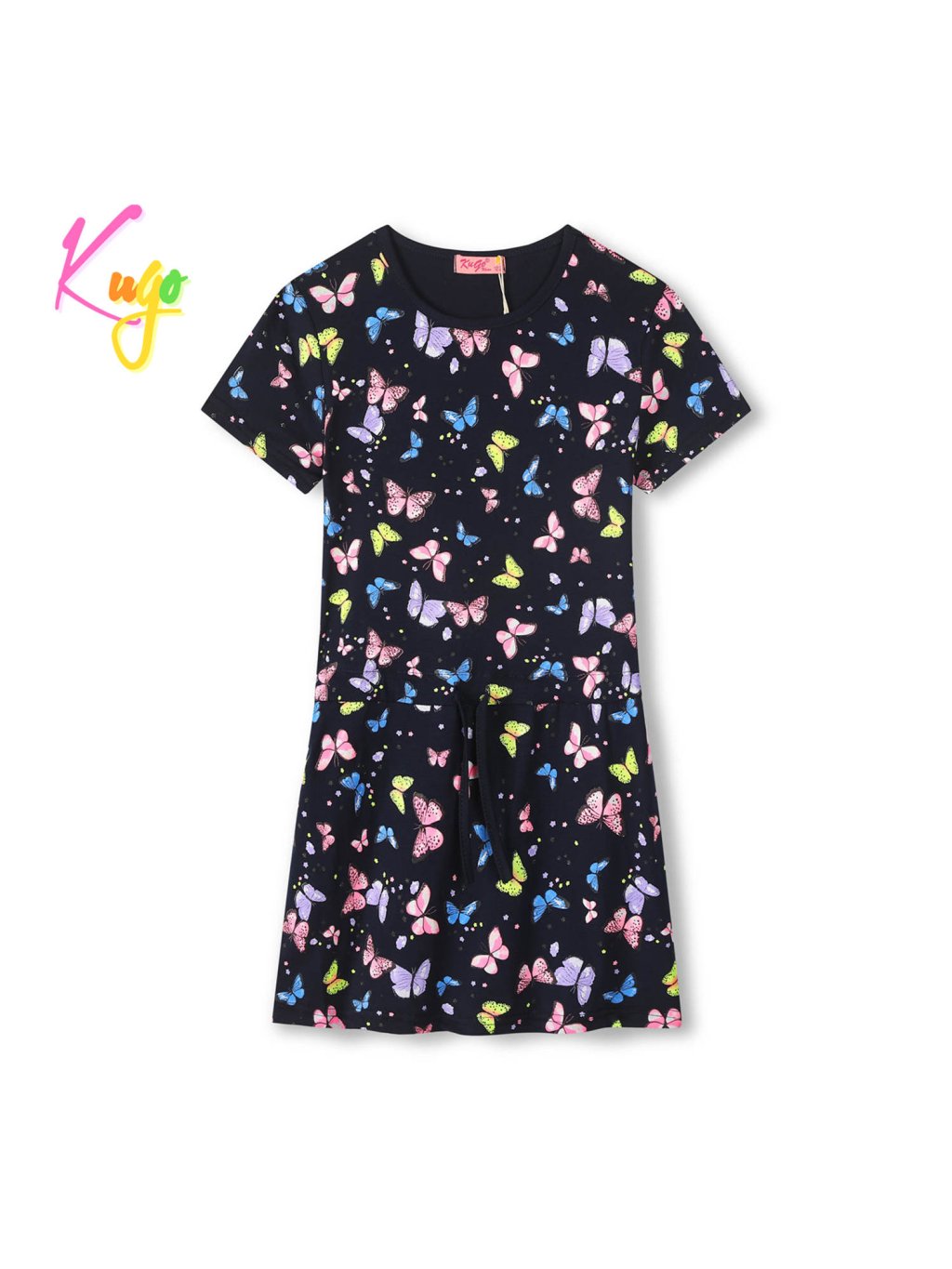 Dívčí bavlněné šaty s potiskem motýlků, krátký rukáv, v pase šňůrka na stažení