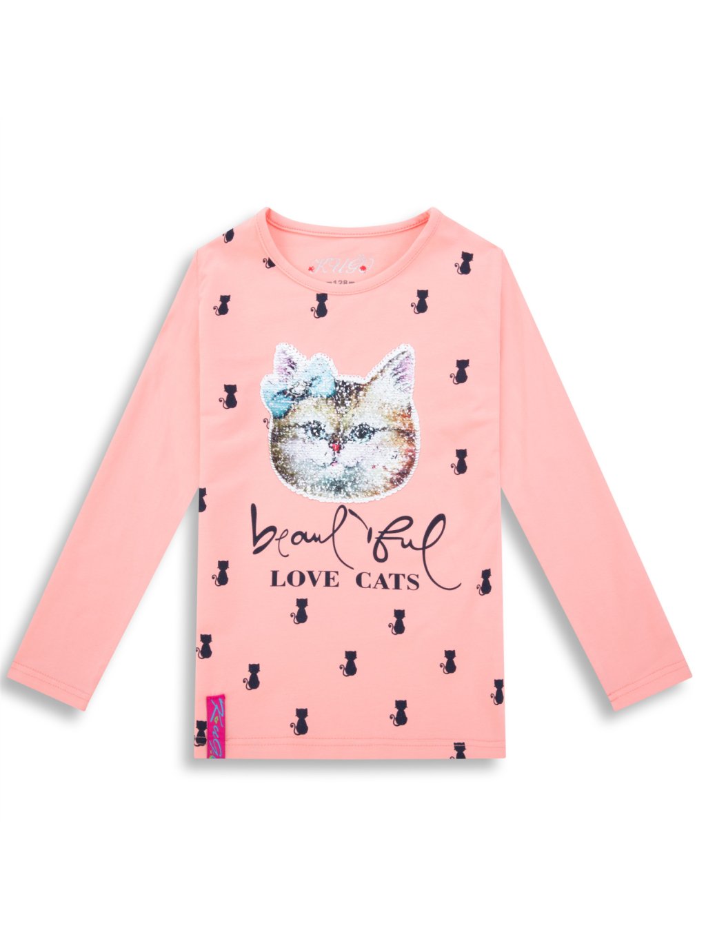 Dívčí triko dlouhý rukáv s měnícími se flitry, kočička se změní z barevné na stříbrnou, materiál 95% bavlna, 5% elastan
